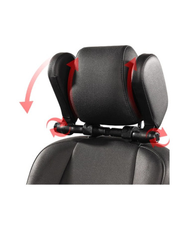 • Anchura y altura ajustables – Puede ajustar la anchura entre los dos reposacabezas seleccionando la posición de la ranura en la barra telescópica (distancia mínima entre las almohadas: 27 cm / 10.63 pulgadas). Las almohadas también pueden subirse, bajarse y girarse 180° para adaptarse a diferentes alturas. Cuando no se necesiten, simplemente levántelas para ahorrar espacio dentro del coche.